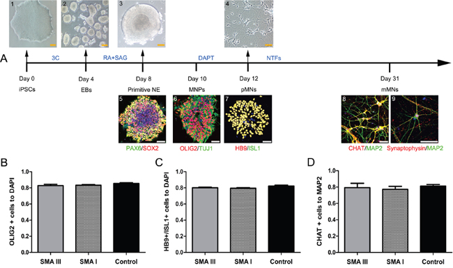 Figure 3: Stepwise differentiation of motor neurons. A. Schematic diagram of motoneuron differentiation (SMA III iPSCs). Human PSCs (1) were induced to neuroectodermal EBs (2) in the presence of three small molecular compounds (3C) for 4 days, then were patterned to PAX6+/SOX2+ primitive neuroepithelia (NE, 3 and 4) and OLIG2+/TUJ1+ motor neuron progenitors (MNPs, 5) for 4-6 days with retinoic acid (RA) and SAG. The MNPs were then plated onto laminin substrate to generate HB9+/ISL1+ postmitotic MNs (6, 7) with DAPT for 3 days and to generate CHAT+/Synaptophysin+/MAP2+ mature mMNs (8, 9) with neurotrophic factors (NTFs) for approximately three weeks. B-D. Quantification of the percentage of OLIG2+ MNPs on Day 10 (B), HB9+/ISL1+ pMNs on Day 12 (C), and ChAT+ mMNs on Day 31 (D) showed no significant differences in differentiation efficiency (n=3, one way ANOVA, P > 0.5) among SMA III, SMAI and Control cultures. All data are represented as the mean ± SEM. Scale bar, 50 μm.