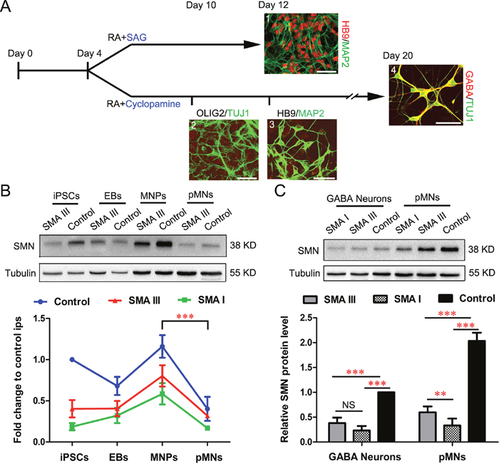 Figure 4: Enriched postmitotic MNs and GABA neurons for SMA modeling. A. Schematics for postmitotic MNs (1) and postmitotic GABA neurons (4) differentiation (SMA III iPSCs). Immunofluorescent images of HB9+/MAP2+ pMNs (1) on Day 12, non-MNs for OLIG2-/TUJ1+ (2) on Day 10, HB9-/MAP2+ (3) on Day 12 and GABA+/TUJ1+ (4) on Day 20, respectively. Scale bar, 50 μm. B. Expression of SMN protein at different stages during differentiation of pMNs from SMA III, SMA I and Control iPSCs was examined by western blot (n=3). C. SMN protein levels were analyzed by western blot at the postmitotic MNs and GABA neurons and samples grouped as SMA III, SMA I or Control (n=5). All the groups were collected and sampled under the same conditions. All data are presented as the mean ± SEM. **P < 0.01, ***P < 0.001; one-way ANOVA was used for the data analysis.