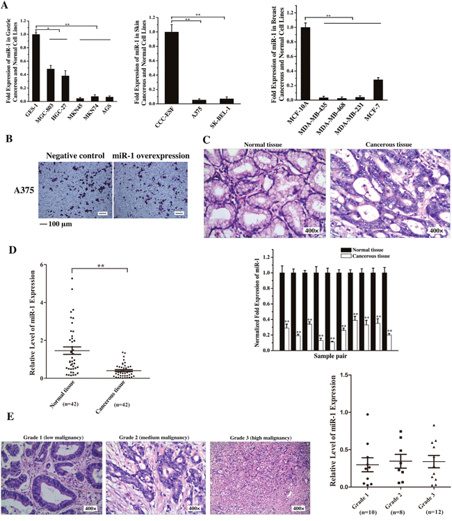 Figure 1: Downregulation of miR-1 in gastric cancer cells and tissues. A. The expression of miR-1 in gastric cancer, skin cancer, breast cancer and normal cell lines. miR-1 expression was measured by quantitative real-time PCR in cancer cells and compared with that in the normal GES-1, CCC-ESF and MCF-10A cells. B. Influence of miR-1 overexpression on human skin cancer A375 cell migration. A375 cells were transfected with the miR-1 precursor or the negative control. At 48 h after transfection, cell migration was examined. Representative images are shown. Scale bar, 100 μm. C. The expression of miR-1 in tumor specimens from gastric cancer patients. Cancerous tissue and corresponding normal tissue from the same patients were examined as paired samples (n=10). The samples were characterized using haematoxylin and eosin staining (400×) and quantitative real-time PCR of miR-1. D. Scatter plot showing the expression level of miR-1 in tumor (n=44) and corresponding normal samples (n=42) from gastric cancer patients. The expression of miR-1 was measured using quantitative real-time PCR. E. The expression of miR-1 in gastric cancers at various stages of differentiation. Cancer tissue samples were divided into three grades using hematoxylin and eosin staining (400×). The expression level of miR-1 in grade 1 (n=10), grade 2 (n=8) and grade 3 (n=12) samples was analyzed by quantitative real-time PCR. Statistically significant differences are indicated with asterisks (*, p < 0.05; ** p < 0.01).