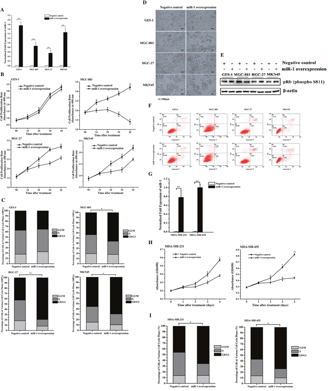 Figure 2: Effects of miR-1 on the growth of gastric and breast cancer cells and normal cells. A. miR-1 overexpression in gastric cancer and normal cells. MGC-803, HGC-27, MKN45 and GES-1 cells were transfected with the miR-1 precursor or the negative control miRNA. At 48 h after transfection, the miR-1 expression was detected with quantitative real-time PCR. B. Cell proliferation rate. Cells were transfected with the precursor miR-1 or the negative control miRNA. From 1 d to 5 d after transfection, cell growth was examined using cell proliferation assays. C. Effects of miR-1 on the cell cycle. At 48 h after cells were transfected with the miR-1 precursor or the negative control, the cell cycle of cancer and normal cells was evaluated with flow cytometry. D. Cell senescence analysis. Cells transfected with the precursor miR-1 or the negative control miRNA were treated using senescence-associated β-galactosidase staining. Representative images are shown. Scale bar, 100 μm. E. Detection of pRb phosphorylation. Cells treated with the precursor miR-1 or the negative control miRNA were subjected to Western blot analysis with the phosphorylated pRb antibody (P-pRb). β-Actin was used as a control. F. Detection of gastric cancer cell apoptosis using flow cytometry. Cells transfected with the precursor miR-1 or the negative control miRNA were subjected to apoptosis assays with AnnexinV. G. The overexpression of miR-1 in breast cancer cells. Breast cancer cells (MDA-MB-231 and MDA-MB-435) were transfected with 30 nM of the miR-1 precursor or the negative control miRNA. After 48 h after, the cells were analyzed using quantitative real-time RT-PCR. H. The effect of miR-1 overexpression on breast cancer cell proliferation. Breast cancer cells were transfected with 30 nM of the miR-1 precursor or the negative control miRNA. Then, cell growth was examined daily. I. Effects of miR-1 overexpression on breast cancer cell cycle. The breast cancer cells transfected with the miR-1 precursor were subjected to cell cycle assays. In all panels, data are shown as mean ± standard deviation from three independent experiments (* p < 0.05; ** p < 0.01).