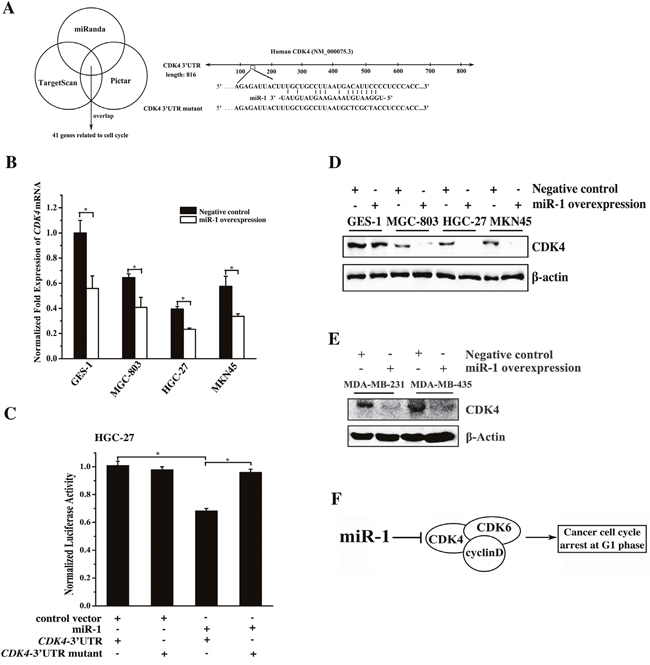Figure 3: Mechanism of gastric and breast cancer cell cycle regulation mediated by miR-1. A. Prediction of miR-1 target genes. The miR-1 targets related to the cell cycle were predicted using the miRanda, TargetScan and PicTar algorithms. CDK4 was predicted to be a target gene of miR-1. B. Expression levels of endogenous CDK4 in response to miR-1 overexpression in cells. Cells were transfected with the miR-1 precursor or the negative control. Twenty hours later, the level of CDK4 mRNA was detected using quantitative real-time PCR. C. Interaction between miR-1 and CDK4. The miR-1 construct or the vector only and the luciferase plasmid containing the 3′UTR of CDK4 mRNA or its mutant were co-transfected into HGC-27 cells. Then the luciferase activities were detected. The Renilla luciferase values were normalized to the firefly luciferase values. D. Western blot analysis of CDK4. Cells were treated with 30 nM of the miR-1 precursor or the negative control RNA for 48 h and whole-cell extracts were analyzed by Western blot analysis. β-actin was used for protein loading correction. E. Effects of miR-1 overexpression on its target gene expression in breast cancer cells. Breast cancer cells were transfected with 30 nM of the miR-1 precursor or the negative control miRNA. After 48 h, the expression of CDK4 in the cells was analyzed by Western blot. β-actin was used as a control. F. Model for the miR-1-mediated pathway in the cell cycle of cancer cells. Statistically significant differences are indicated with asterisks (*, p < 0.05; ** p < 0.01).