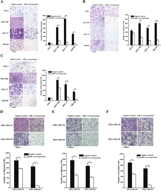 Figure 4: Effects of miR-1 on gastric and breast cancerous cell metastasis. A. Effect of miR-1 on gastric cancer cell metastasis. Gastric cancer cells (MGC-803, HGC-27 and MKN45) and the normal cells (GES-1) were transfected with the miR-1 precursor or the negative control. At 48 h after transfection, cell migration was examined, and the data were analyzed. Representative images are shown. Scale bar, 100 μm. B. Effects of miR-1 overexpression on the adhesion of gastric cancer cells. The cells were transfected with the miR-1 precursor or the negative control and then cultured for 48 h. The number of adherent cells was evaluated. Representative images are shown. Scale bar, 100 μm. C. The role of miR-1 in cancer cell invasion. miR-1 precursor-transfected cells were cultured for 48 h. Then, the cells were characterized with cell invasion assays. Scale bar, 100 μm. D. Evaluations of breast cancer cell migration. MDA-MB-231 and MDA-MB-435 cells were transfected with 30 nM of the miR-1 precursor or the negative control miRNA to overexpress miR-1. At 48 h after transfection, the migrated cells were examined. Representative images are shown. Scale bar, 100 μm. E. The influence of miR-1 overexpression on breast cancer cell invasion. At 48 h after miR-1 overexpression, the invaded cells were evaluated. Representative images are provided. Scale bar, 100 μm. F. Cell adhesion assays. Breast cancer cells treated with the miR-1 precursor were cultured for 48 h, then, the adherent cells were examined. Representative images are indicated. Scale bar, 100 μm. In all panels, asterisks represent statistically significant differences between treatments (*, p < 0.1; **, p < 0.05).