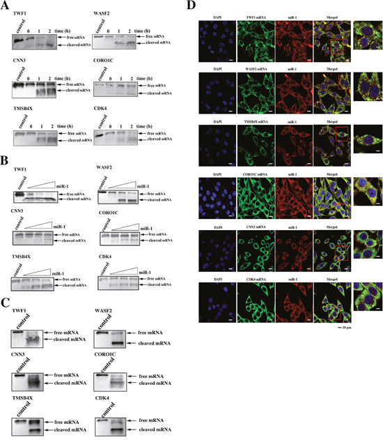 The above data indicated that miR-1 could inhibit tumor growth and metastasis by targeting CDK4 gene and TWF1, WASF2, TMSB4X, CNN3 and CORO1C genes, respectively. To explore whether miR-1 could simultaneously suppress tumor growth and metastasis by synchronously regulating the expressions of these six target genes, the miR-1-guided cleavage of the target mRNAs in the Ago complex was investigated. The time-course results showed that all six targets could be cleaved in the miR-1-Ago complex (Figure 6A). The miR-1-guided cleavage of target mRNAs in the Ago complex occurred in a miRNA-concentration-dependent manner (Figure 6B), indicating that miR-1 could guide the cleavage of its targets. When the six target mRNAs were co-incubated at equivalent levels with the miR-1-Ago2 complex, all six mRNAs were cleaved (Figure 6C). These findings revealed that miR-1 could simultaneously guide the cleavage of its six target mRNAs.