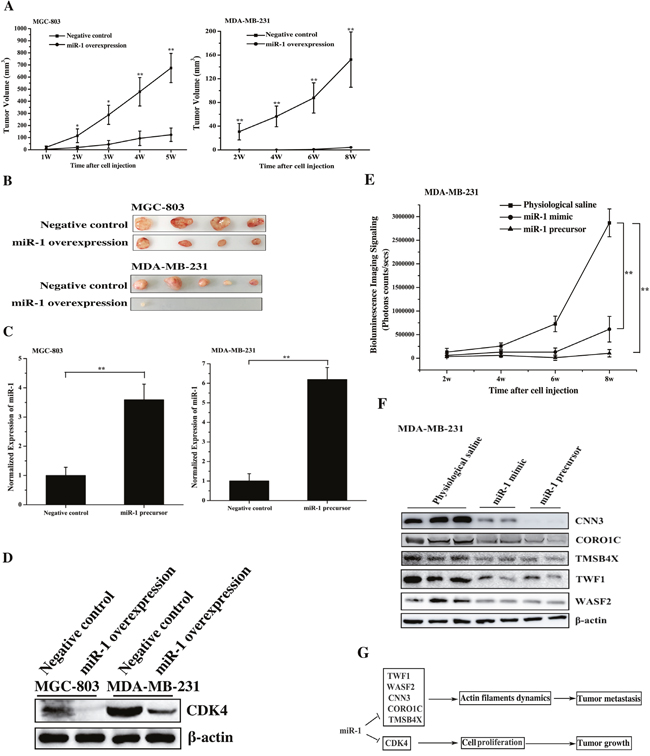 Figure 7: The miR-1-mediated tumor suppression in vivo. A. Effect of miR-1 overexpression on tumor growth in vivo. Gastric cancer cells (MGC-803) or breast cancer cells (MDA-MB-231) were transfected with the miR-1 precursor or the negative control. At 48 h after transfection, the cells were subcutaneously injected into nude mice. And subsequent tumor growth was examined weekly. B. The sizes of the tumors in mice. Mice were treated with miR-1-overexpressing MGC-803 cells or miR-1-overexpressing MDA-MB-231 cells. As controls, cells transfected with the negative control were also injected into mice. C. The miR-1 expression levels in tumors derived from miR-1-overexpressing MGC-803 cells or miR-1-overexpressing MDA-MB-231 cells using quantitative real-time PCR analysis. D. Western blot analysis of the miR-1 target CDK4 in tumors. E. The time course evaluation of breast cancer metastasis. The mice that received different treatments were subjected to bioluminescence imaging at various time points after the cell injection. F. The effect of miR-1 on the expression levels of its target genes in solid tumors. The solid tumors were analyzed by Western blot to detect the expression of WASF2, TWF1, CNN3, CORO1C and TMSB4X. The treatments are indicated at the top. G. Model for the miR-1-mediated inhibitory mechanism of tumor growth and metastasis. In all panels, asterisks indicate significant differences (*, p < 0.05; **, p < 0.01) between treatments.