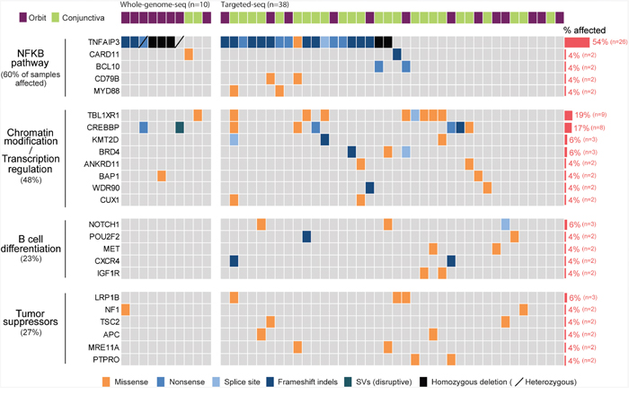 Figure 2: Landscape of somatic alternations in ocular MZL. Somatic alternations detected by whole genome (n=10) and targeted sequencing (n=38) are represented as a heatmap. Each column and row represents an affected individual and a gene, respectively. Genes altered in at least two patients were selected, and the fraction of affected individuals per gene is shown on the right. Mutated genes were clustered into four groups according to signaling pathway or molecular function.