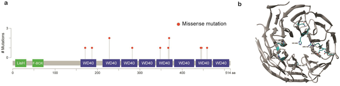 Figure 3: Schematic representation of mutations in TBL1XR1. a. Location of missense mutations in the TBL1XR1 protein. Frequency of missense mutations (y-axis) is shown by amino acid (x-axis). b. Protein structure of TBL1XR1 with mutations. Mutant residues are highlighted in cyan. Mutations are incorporated into TBL1XR1 model using swapaa tool of Chimera version 1.10.2 considering appropriate rotamer.