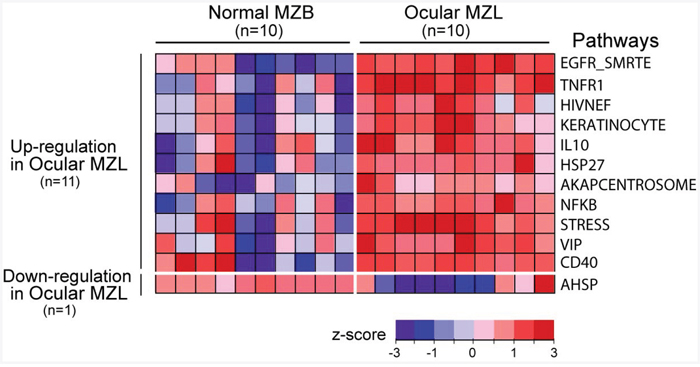 Figure 4: Gene expression signature in ocular MZL. Differentially expressed pathways between ocular MZL (n=10) and normal marginal zone B-cell samples (n=10) are shown (p-value <0.01 from a two-sided t-test). The pathway activity level calculated by ssGSEA is a transformed z -score and is shown as a heatmap.