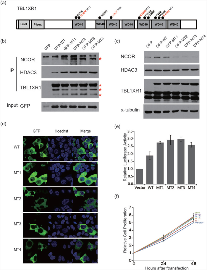 Figure 5: Functional characterization of TBL1XR1 WD40 domain alternations. a. Schematic diagram of the structure of TBL1XR1. Mutants occurred in the WD40 domain as indicated with circles. b. Co-immunoprecipitation of TBL1XR1 mutants. TBL1XR1 physically interacts with NCoR repressor complexes. Mutant TBL1XR1 interacts with NCoR and HDAC3 more frequently than wild-type TBL1XR1. c. Expression of NCoR protein levels in cells transfected with wild-type or mutant TBL1XR1. d. Fluorescence images of TBL1XR1 and Hoechst staining and merged images in 293T cells transfected with each TBL1XR1 mutant. e. NF-κB activity assay measuring the effects of each TBL1XR1 mutant. f. Cell proliferation comparison of TBL1XR1 mutants expressed in cells over 48 h using a CCK-8 assay.
