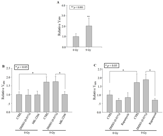 Figure 1: RIBE after X-ray irradiation. Relative MN yields in bystander A549 cells co-cultured with cells irradiated with 9 Gy X-ray (in the transwell insert system). A. No drug treatment. B. Treating the irradiated cells with MK-2206 (an inhibitor of Akt). C. Treating the irradiated cells with Rapamycin (an inhibitor of m-TOR). Data were pooled from at least three independent experiments and the results are presented as means±S.D.
