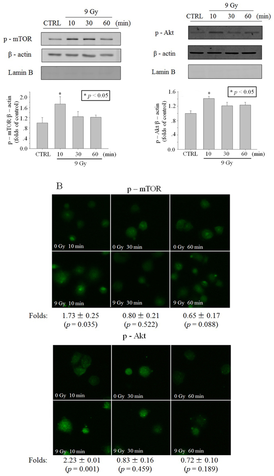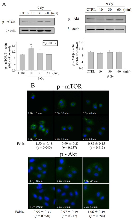 Figure 2: Activation of Akt/mTOR in whole cells after X-ray irradiation. Time function of p-mTOR or p-Akt level in A549 cells irradiated with 9 Gy X-ray, revealed through western blot A. or immunofluorescence B. (blue: Hoechst; green: FITC). Data were pooled from at least three independent experiments and the results are presented as means±S.D.