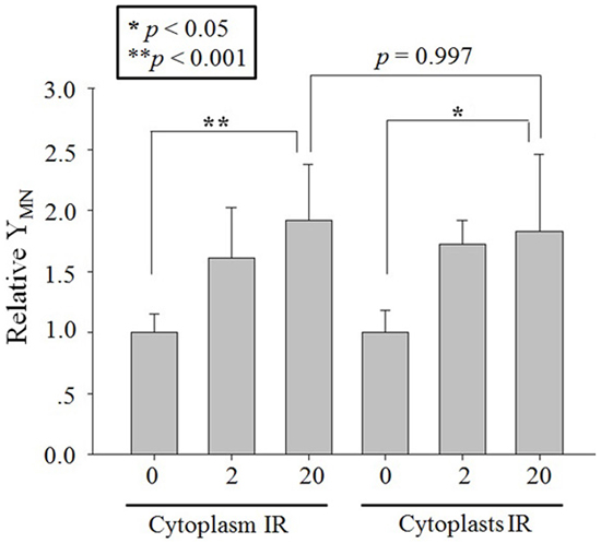 Figure 4: RIBE after proton targeting. Relative MN yields in bystander A549 cells co-cultured with 2 or 20 protons targeted twenty A549 cytoplasts or cytoplasm part of twenty A549 cells. Data were pooled from at least four independent experiments and the results are presented as means±S.D.