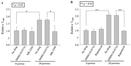 Figure 5: Effect of inhibitors on cytoplasts targeting-induced bystander effect. Relative MN yields in bystander A549 cells co-cultured with 20 protons targeted twenty A549 cytoplasts, which were treated with MK-2206 A. or rapamycin B. before irradiation. Data were pooled from at least three independent experiments and the results are presented as means±S.D.