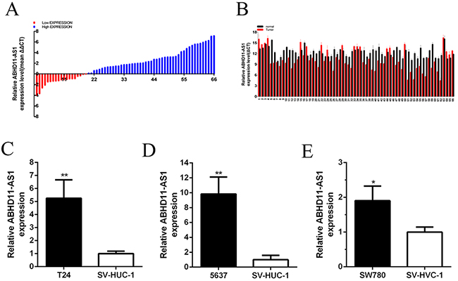 Figure 1: ABHD11-AS1 was overexpressed in bladder cancer tissues and cell lines. A. qPCR was utilized to detect relative concentration of ABHD11-AS1 in bladder cancer. B. The relative expression level of ABHD11-AS1 was increased in bladder cancer tissues compared with normal tissues by using paired discrete plots. Compared to SV-HUC-1, the relative expression level of ABHD11-AS1 was increased in bladder cancer T24 C. 5637 D. and SW780 E. cells. The data of each group is multiplied by (-1) in Figure 1. Assays were performed in triplicate. All data are shown as mean ± SD (*p < 0.05, **p < 0.01).