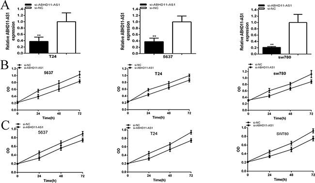 We further determined whether ABHD11-AS1 promoted cell proliferation in bladder cancer. The relative expression levels of ABHD11-AS1 were analyzed by qRT-PCR at 48 hours after transfection of siRNAs or plasmids in bladder cancer cell lines.