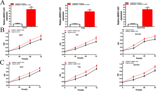And the relative expression levels of ABHD11-AS1 were up-regulated significantly at 48 hours post transfection of pcDNA3.1-ABHD11-AS1 in 5637(p=0.00031), T24 (P=0.000151) and SW780 (p=0.000115) cells (Figure 3A). In the 5637 cell lines, the relative expression of ABHD11-AS1 was up-regulated about 6.64-fold over the control. In T24 cell lines, the relative expression of ABHD11-AS1 was up-regulated about 5.74-fold over the control. In SW780 cell lines, the relative expression of ABHD11-AS1 was up-regulated about 7.13-fold over the control. CCK-8 and MTT assays showed that pcDNA3.1-ABHD11-AS1 increased cell proliferation remarkably in bladder cancer cells (p < 0.001 in three cell lines) (Figure 3B and 3C).