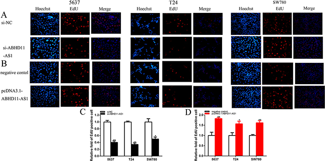 EdU assay was further illustrated to detect cell proliferation. As shown in Figure 4A–4D, compared to si-NC, EdU positive 5637, T24 and SW780 cells in si-ABHD11-AS1 were reduced after transfection, and compared to negative control group, EdU positive 5637, T24 and SW780 cells in pcDNA3.1-ABHD11-AS1 group were increased after transfection. EdU assay illustrated that the quantity of EdU positive cells in si- ABHD11-AS1 group was reduced by 59.9% in 5637 (P = 0.005 520), decreased by 65.9% in T24 (P = 0.0028 849) and suppressed by 49.8%in SW780 (P = 0.024 164) (Figure 4A and 4C). The quantity of EdU positive cells in pcDNA3.1-ABHD11-AS1 group was increased by 1.83-fold in 5637 (P= 0.006 370), increased by 1.57-fold in T24 (P= 0.018 482) and increased by 1.62-fold in SW780 (P = 0.002 179) (Figure 4B and 4D).