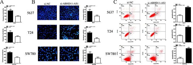 Figure 6: Effects of si-ABHD11-AS1 on apoptosis. Apoptosis was detected by caspase 3 ELISA assays, Hoechst 33258 assays and flow cytometry assays. The activity of caspase-3 was higher significantly after transfection with si-ABHD11-AS1 in 5637, T24 and SW780 A. More apoptosis cells were measured significantly after transfection with si-ABHD11-AS1 in 5637, T24 and SW780 B. Apoptosis ratio was observed using flow cytometry assays. More apoptotic cells were detected in si-ABHD11-AS1 group compared with si-NC group in 5637, T24 and SW780 C. Assays were performed in triplicate. All data are shown as mean ± SD (*p < 0.05, **p < 0.01).