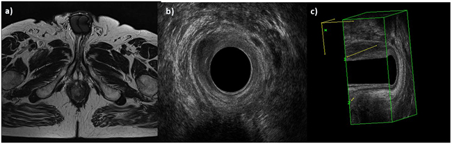 Anal carcinoma is a rare malignancy with an incidence of 2 new cases per 100,000 per year in the USA [1], accounting approximately 0.4% of all tumors and 2.5% of gastrointestinal malignancies [2-4]. Risk factors associated are the number of sexual partners, genital warts, vulvar, vaginal or cervical cancer, and viral infections by human papillomavirus (HPV), and human immunodeficiency virus (HIV) [3-6]. The diagnosis based only on history and clinical data is difficult since the symptoms reported by patients are similar to those with benign diseases: the 45 % of patients report rectal bleeding, 20–35% anorectal pain and 20-35% sensation of a rectal mass [7-8]. Proper recognition of the anal cancer is crucial for the patient management, whereas an early detection allows conservative treatment with a reserve of sphincter function [9]. The recent improvements of radiotherapy and chemotherapy as neoadjuvant therapies, can also down staging the lesion, as well as to allow a conservative treatment [9-11]. According to National Comprehensive Cancer Network (NCCN) Anal Carcinoma Guidelines the patients should be subjected to a careful clinical examination, including a digital rectal examination (DRE), an anoscopic examination, and palpation of inguinal nodes, to evaluate T stage, while the role of Computed Tomography (CT) and Magnetic Resonance Imaging (MRI) is limited to the identification of regional nodes, the endoanalultrasound (EAUS) is not recommended [12]. The EAUS and MRI allow a detailed evaluation of the multilayer wall of the ano, sphincter plan, relations with adjacent structures and the presence of lymphadenopathy, which is mandatory in staging, to identify a correct therapeutic strategy. Three Dimensional (3D) -EAUS is a valuable tool to represent the normal anatomy and diseases of the anal canal. It is easy to perform and to reproduce, painless, with high diagnostic accuracy. It provides excellent imaging of the anal wall, of the internal and external sphincters and of the intersphincteric plane, essential for planning surgical approach [13]. 3D-EAUS is the technique of choice in benign anal diseases [14]. MRI is the gold standard in oncological pelvic examination, providing morphological and functional data [15]. Moreover, MR imaging plays an important role in therapeutic assessment, properly stratify patients into responders or non-responders to neoadjuvant treatment, in surveillance after surgery, and in recurrence [15-16].