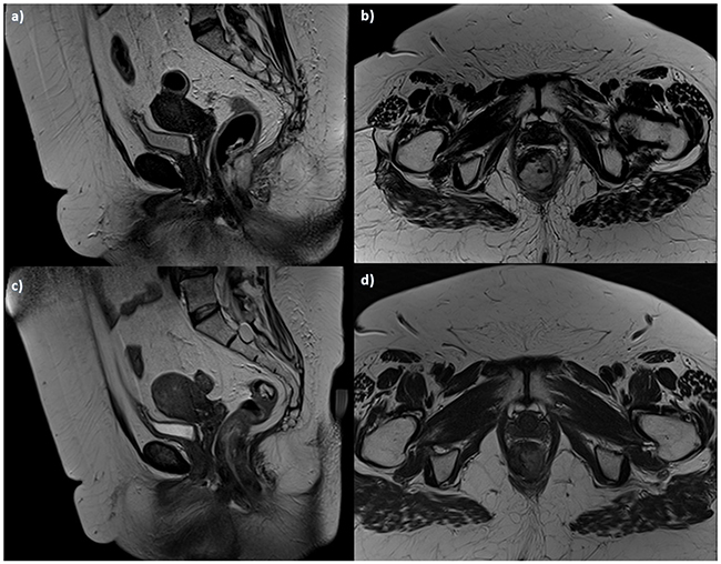 Figure 3. Woman 54y, anal cancer. TSE T2-W in sagittal a. and axial b. plane, pre-treatment morphological assessment: the lesion infiltrates internal and external sphincters. Post treatment assessment: TSE T2-W images in sagittal c. and axial d. plane show tumor size reduction, with residual tissue.