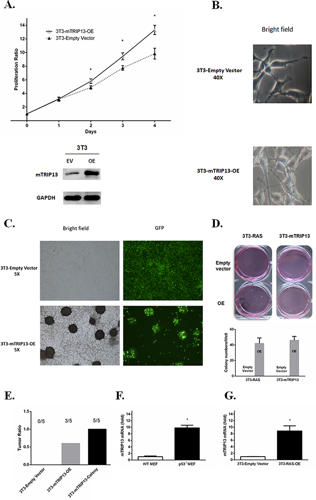 Figure 3: TRIP13 promotes tumorigenesis in NOD-Rag/null gamma mice. A. Murine Tripl3 (mTRIP13) overexpression was identified in NIH/3T3 cells transfected with mTRIP13 overexpressing plasmids (OE) compared to those transfected with empty vector (EV) (below panel). Cells were counted by trypan blue exclusion for consecutive 4 days (upper panel). Overexpression of mTRIP13 resulted in increased cell growth. Results from 3 independent experiments are shown (*p < 0.05). B. Morphology of NIH/3T3-Empty Vector or NIH/3T3-mTRIP13-OE cells was shown in liquid media under microscope with bright field (magnification×40). C. Overall growth of NIH/3T3-Empty Vector or NIH/3T3-mTRIP13-OE cells was shown in liquid media under microscope with bright field and green fluorescence (GFP) (magnification×5). D. Representative images of overall colony formation of NIH/3T3-mTRIP13-EV or NIH/3T3-mTRIP13-OE cells along with NIH/3T3 cells transfected with KRAS overexpressing plasmids (3T3-RAS-OE) or empty vector (3T3-RAS-EV) in each well were shown (upper panel). Colony-forming numbers were quantified with software ImageJ and results were from 3 independent experiments (below panel). E. NIH/3T3-Empty Vector or NIH/3T3-mTRIP13-OE, as well as the isolated colony-forming cells (3T3-mTRIP13-Colony) were subcutaneously injected (2.5×105 cells/flank) into NOD/SCID mice and assessed for tumor formation on day 26 post injection. F. The mTRIP13mRNA level was almost 10-fold higher in p53 knockdown mouse embryo fibroblast (p53-/-MEF) compared to wild type MEF (WT MEF). Results from 3 independent experiments are shown(*p <0.05). G. The mTRIP13mRNA level was 8-fold higher in KRAS mutated and overexpressed NIH/3T3 (3T3-RAS-OE) compared to control cells transfected with empty vector. Results from 3 independent experiments are shown (*p <0.05).