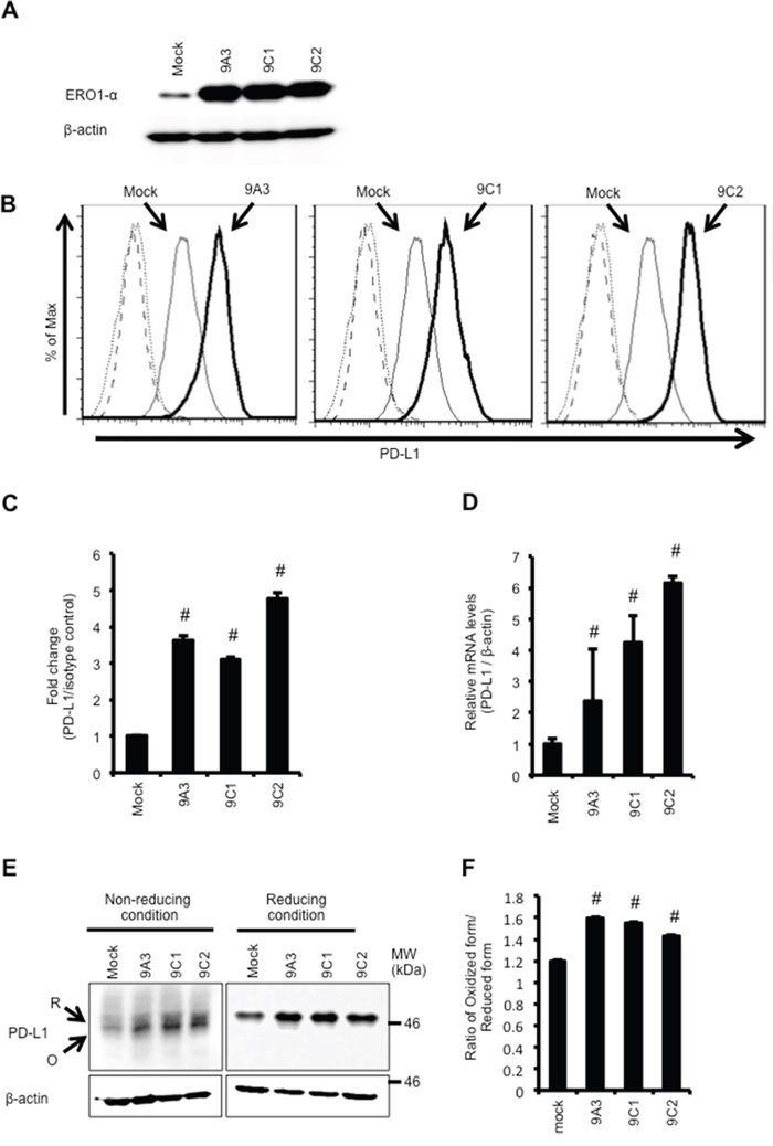 Figure 1: Overexpression of ERO1-α upregulates PD-L1 expression via accumulation of HIF-1α. A. Western blot analysis of MDA-MB-231 mock and ERO1-α-overexpressed (OE: 9A3, 9C1 and 9C2) cells. B. Flow cytometric analysis of PD-L1 expression on mock (thin line) and OE cells (left: 9A3, middle: 9C1, right: 9C2; bold line). These cells incubated with a PE-labeled isotype control served as background controls (dotted line and dashed line). C. The mean fluorescence intensity (MFI) value obtained in mock cells was set to 1, and differences in MFI caused by 9A3 cells, 9C1 cells and 9C2 cells were plotted. D. PD-L1 mRNA levels in mock and OE cells determined by real-time PCR. E. Redox status of PD-L1 was examined by Western blotting under reducing or non-reducing conditions. Reduced form (R) or oxidized form (O) of PD-L1 is indicated. F. The ratio of the oxidized form and reduced form of PD-L1 was obtained by densitometry analysis. Data are shown from single experiments representative of three experiments performed. #p<0.05, Dunnett’s test.