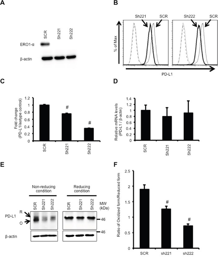 Figure 2: Knockdown of ERO1-α downregulates PD-L1 expression via decreased oxidative protein folding. A. Western blot analysis of MDA-MB-231 scrambled shRNA-transfected (SCR) and ERO1-α knockdown (KD: sh221 and sh222) cells. B. Flow cytometric analysis of PD-L1 expression on SCR (thin line) and KD cells (left: sh221, right: sh222; bold line). These cells incubated with a PE-labeled isotype control served as background controls (dotted line and dashed line). C. The mean fluorescence intensity (MFI) value obtained in SCR cells was set to 1, and differences in MFI caused by sh221 cells and sh222 cells were plotted. D. PD-L1 mRNA levels in SCR and KD cells determined by real-time PCR. E. Redox status of PD-L1 was examined by Western blotting under reducing or non-reducing conditions. Reduced form (R) or oxidized form (O) of PD-L1 is indicated. F. The ratio of the oxidized form and reduced form of PD-L1 was obtained by densitometry analysis. Data are shown from single experiments representative of three experiments performed. #p<0.05, Dunnett’s test.