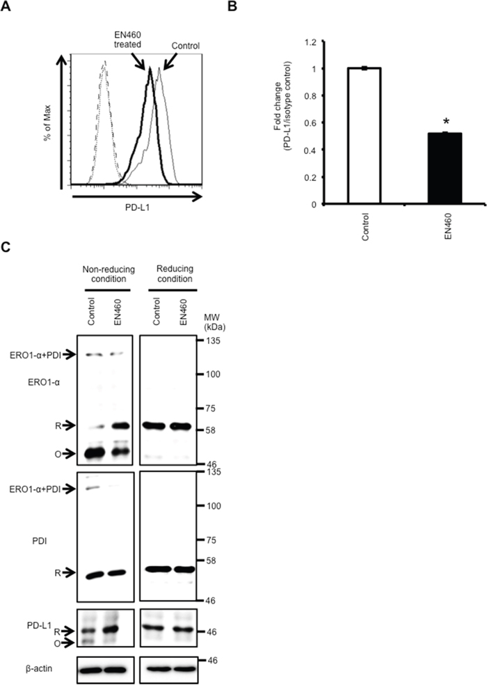 Figure 3: Functional inhibition of ERO1-α by using the ERO1-α inhibitor EN460 caused a decrease in the expression of PD-L1. A. Flow cytometric analysis of PD-L1 expression on control cells (thin line) and MDA-MB-231 cells treated with the ERO1-α inhibitor EN460 (12.5μM) (bold line). These cells incubated with a PE-labeled isotype control served as background controls (dotted line and dashed line). B. The ratios of MFI of PD-L1 and the isotype control were compared in control cells and EN460 (12.5 μM) -treated cells. C. Redox status of ERO1-α, PDI, and PD-L1 was examined by Western blotting under reducing or non-reducing conditions. Reduced form (R) or oxidized form (O) of each protein is indicated. * p<0.001, unpaired Student’s t-test. Data are shown from single experiments representative of four experiments performed.