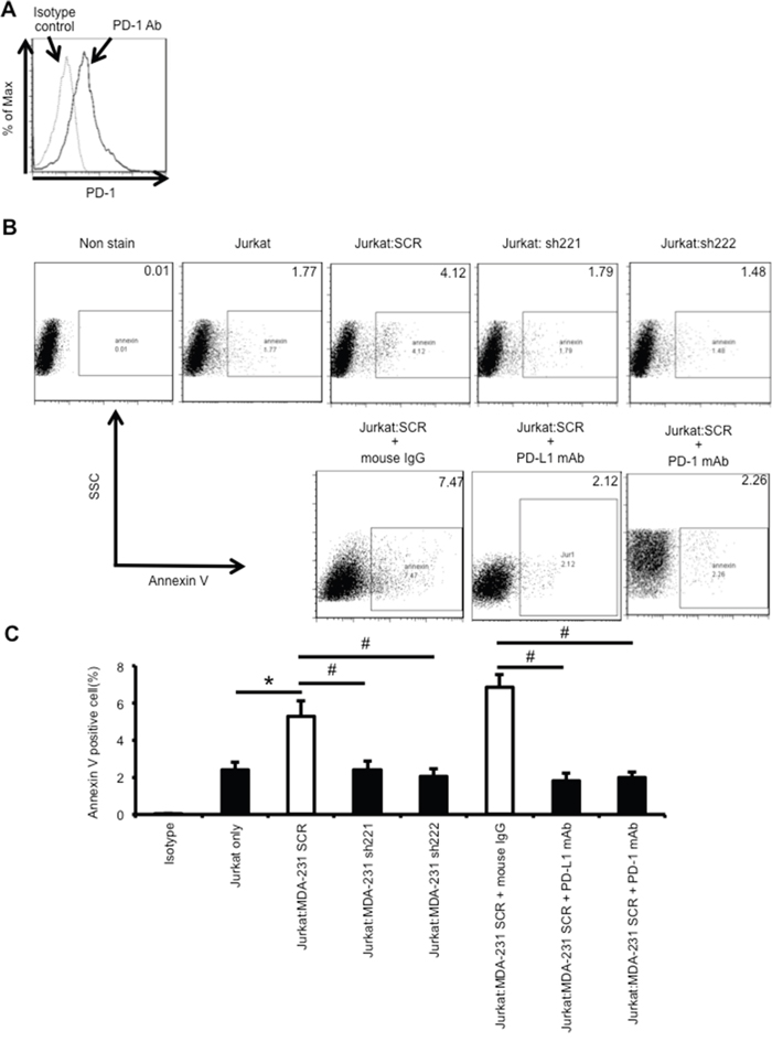 To examine the effect of tumor cells on lymphocyte apoptosis, 5×106 MDA-MB-231 SCR cells and KD cells were cocultured with 5×105 Jurkat leukemia T cells in the presence of mouse IgG (2 or 5 μg/ml; 17314; IBL Co., Ltd., Gunma, Japan), anti-human PD-L1 antibody (5 μg/ml; MIH1; BD) or anti-PD-1 antibody (2 μg/ml; EH12.2H7; BioLegend) in a 6-well plate for 24 hours. To block the PD-1/PD-L1 pathway, SCR cells were preincubated with anti-human PD-L1 antibody (5 μg/ml; BD) for 30 min or Jurkat cells were preincubated with anti-PD-1 antibody (2 μg/ml; BioLegend) for 30 min. Extent of apoptosis in Jurkat cells was determined by flow cytometry using FITC-Annexin V (11858777001; Roche) according to the manufacturer's instructions.