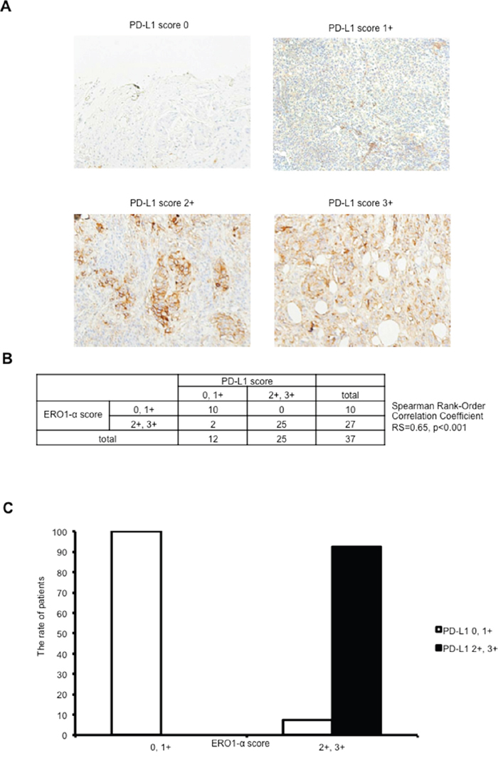 Figure 5: Expression of ERO1-α in triple negative breast cancer was correlated with the expression of PD-L1 in clinical cases. A. Tumors were classified into 4 groups by stainability for PD-L1. B. Tumors were analyzed for correlation between the expression of ERO1-α and expression of PD-L1 by Spearman’s rank-order correlation coefficient. C. The ERO1-α score 0, 1+ group showed significantly reduced expression of PD-L1 compared with that in the ERO1-α score 2+, 3+ group.