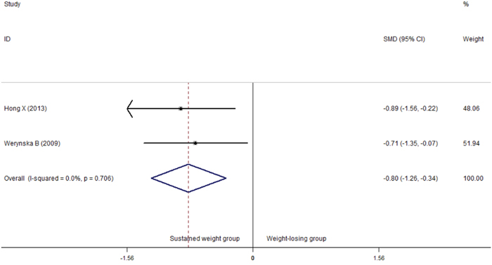 Figure 6: Comparison of differences of the serum leptin concentration in weight-losing group and in sustained weight group. Failure of this confidence interval to include zero indicates no statistical difference between the weight-losing group and sustained weight group. Negative SMD value suggests the mean of serum leptin concentration of weight-losing group is lower than that of sustained weight group, while positive SMD value suggest the mean of weight-losing group was higher than sustained weight group.