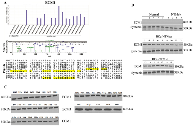 Figure 2: ECM1 detection and validation. A. Mass spectroscopy analysis detected ECM1 expression only in the breast cancer patients with Bronchiectasis non tuberculous Mycobacterium (BCa-NTMnb) infection, but not in the healthy, normal (N1) or individuals with Bronchiectasis non tuberculous Mycobacterium (NTMnb) infection. The spectra (panel 2) and 4 unique peptides (shaded yellow, panel 3) of ECM1 detected in the circulating exosomes. B. Western blotting analysis in the circulating exosomes of the breast cancer patients with Bronchiectasis non tuberculous Mycobacterium (BCa-NTMnb) infection, healthy, normal (N) or individuals with Bronchiectasis non tuberculous Mycobacterium (NTMnb) infection. Syntenin was used as an exosome marker and loading control. C. Western blot analysis of ECM1 in additional 40 BCa subjects.