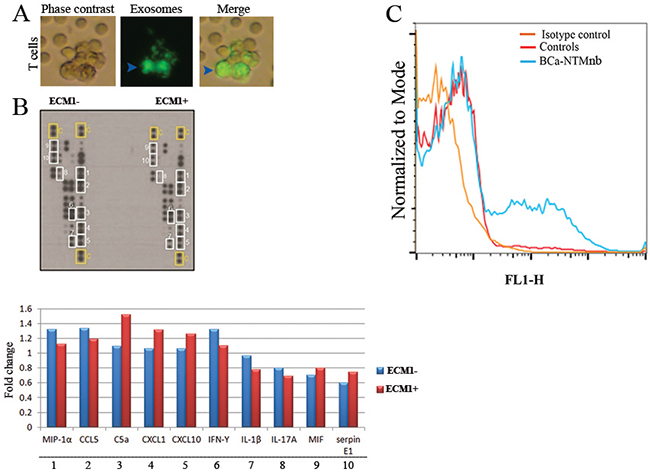 High ECM1 expressing exosomes were enriched from the serum of one BCa-NTMnb subject as follows. Exosomes were incubated with a FITC labelled anti-human ECM1 antibody for 30 minutes at 4°C. The FITC-ECM1 positive exosomes were then purified using anti-FITC magnetic beads (#130-048-701, Miltenyi Biotech) followed by FACS analysis. The ECM1- exosomes from the same subject were used as a control. The HMLE cells were then co-cultured with ECM1+ and ECM1- exosome pool for 7 days [11]. The HMLE cells were cultured in media depleted of exosomes [11]. A similar experiment was performed with the exosomes isolated from one healthy and one NTMnb subject as controls.