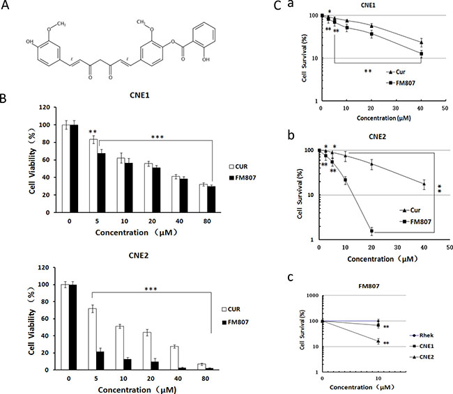 Figure 1: FM807 has a potent antiproliferation effect on NPC cell lines, but showed little impact on non-cancer Rhek cells. (A) The chemical structure of FM807. (B) CNE1 and CNE2 cells were treated for 72 h in the presence of Curcumin and FM807 ranging from 0 to 80 μM. Cellular viability was measured using MTS assay and expressed as a percentage of vehicle-treated control. Results are presented as means ± SD of three independent experiments. *P < 0.05: significant difference from control by ANOVA; **P < 0.01, ***P < 0.001: very significant difference from control by ANOVA. (C) Effect of Curcumin and FM807 on the colony formation of (a) CNE1, (b) CNE2 and (c) Rhek cells. Quantification of the colony formation efficiency is presented as means ± SD of three independent experiments, *P < 0.05: significant difference from control by ANOVA; **P < 0.01, ***P < 0.001: very significant difference from control by ANOVA.