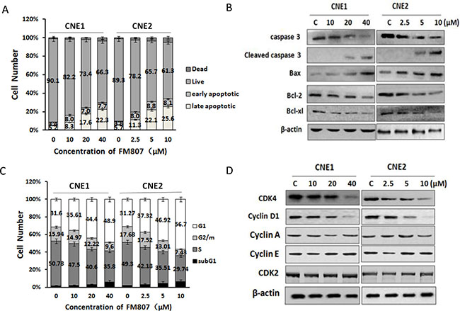 Figure 2: FM807 induces CNE1 and CNE2 cell cycle arrest and apoptosis. (A) CNE1 and CNE2 cells were treated with FM807 for 24 h, and apoptotic cell death was detected by staining cells with an Annexin-V: FITC Apoptosis Detection Kit for later flow cytometry analysis. (B) CNE1 and CNE2 cells were treated with increasing doses of FM807 for 24 h, and apoptosis signal proteins were detected using western blot analysis, β-actin was used as a loading control. (C) CNE1 and CNE2 cells were treated with increasing doses of FM807 for 24 h. Cells were then fixed with 70% ethanol at –20°C overnight, incubated with RNase A at 37°C for 30 min, stained with propidium iodide for 10 min, and analyzed with flow cytometry. (D) CNE1 and CNE2 cells were treated with increasing doses of FM807 for 24 h, and cell cycle signal proteins were detected using western blot analysis.