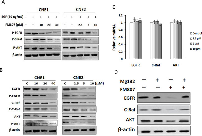 Figure 3: FM807 inhibits EGFR-mediated downstream signaling pathways. (A) Serum-starved CNE1 and CNE2 cells were stimulated with 50 ng/mL EGF for 30 min, and then treated with FM807 for 24 h. The levels of the phosphorylation forms of EGFR (P-EGFR), C-Raf (P-C-Raf), and AKT (P-AKT) were analyzed using western blot. (B) Non-stimulated CNE2 cells were treated with FM807 for 24 h; EGFR, P-EGFR, C-Raf, P-C-Raf, AKT, and P-AKT protein levels were analyzed with western blot. (C) CNE2 cells were treated with FM807 for 24 h. Total RNA was extracted for quantitative real-time PCR of EGFR, C-Raf and AKT, using GAPDH as control. (D) CNE2 cells were pretreated with 1 μM of MG132 for 2 h in the presence or absence of 20 μM of FW807 for an additional 12 h. Whole-cell lysates were subjected to western blot analysis using antibodies against EGFR, C-Raf, AKT, and β-actin.