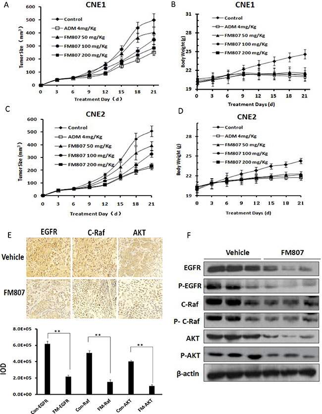 Figure 4: Antitumor activity of FM807 in xenograft models in vivo. (A) CNE1 and (C) CNE2 tumor xenograft nude mice were randomized into vehicle or treatment groups (n = 6/group) and received FM807 at doses of 50, 100, 200 mg/kg i.g., (incorporated drug solid dispersions with poloxamer188, and then diluted with saline) for three weeks. Tumors volume was measured every three days to evaluate the anticancer activity of FM807. Data are presented as means ± SD (n = 6, P < 0.05). (B) CNE1 and (D) CNE2 tumor xenograft mouse body weight was measured every three days. Data are presented as means ± SD (n = 6, P < 0.05). (E) FM807 decreased the expression of EGFR, C-Raf and AKT in CNE2 tumors. “Vehicle” shows the tumor of mice treated by the vehicle; “FM807” represents the tumor of mice treated by 200 mg/kg FM807. (F) Tumor tissues excised from the CNE2 xenograft mice were lysed and changes in the levels of in EGFR, C-Raf, AKT and their phosphorylation forms were tested.