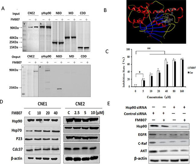 Figure 5: FM807 binds to Hsp90 and blocks Hsp90/client complexes. (A) Western blot confirmed FM807 binds to the NBD of Hsp90. The “–” symbol of FM807-resin represents no drug-loaded affinity column, and the “+” symbol represents the drug-loaded affinity column. The test proteins were CNE2 cell lysate, His-tagged yeast Hsp90, NBD, MD and CDD of yeast Hsp90. Panels a and c show Human Hsp90 antibody; panels b and d show His-probe antibody. (B) Docking model of FM807 binding to N-terminal Hsp90. (C) The influence of FM807 on the ATPase activity of Hsp90 were determined by the malachite green reagent. The assay used 0.5 μM Hsp90 protein, 1 mM ATP, and FM807 or Cur at 0, 5, 10, 20, 40, 80 and 160 μM, to test the absorbance at 635 nm. Results are presented as means ± SD of three independent experiments. *P < 0.05: significant difference from control by ANOVA; **P < 0.01, very significant difference from control by ANOVA. (D) CNE1 and CNE2 cells were treated with FM807 for 24 h; Hsp90, Hsp70, Cdc37 and p23 protein levels were analyzed using western blotting. (E) CNE2 cells were treated by Hsp90 small interfering RNA (siRNA) and control siRNA for 6 h and incubated in normal growth medium for another 48 h. Whole-cell lysates were analyzed using western blotting with antibodies against EGFR, C-Raf, AKT and β-actin.