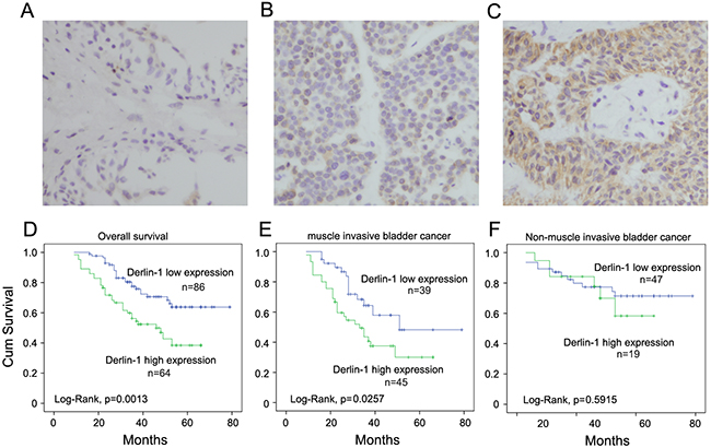 Figure 1: Expression pattern of Derlin-1 protein in bladder cancer tissues. A. Negative Derlin-1 expression in normal bladder urothelial cells. B. Negative Derlin-1 expression in bladder cancer. C. Positive ctyoplasmic staining of Derlin-1 in a case of bladder cancer. D. Kaplan-Meier plots and Log-Rank test showed that Derlin-1 overexpression associated with poor overall survival in patients with MIBC and NMIBC. E. Kaplan-Meier plots of patient with MIBC. Patients with Derlin-1 overexpression showed poor survival. F. Kaplan-Meier plots of patient with NMIBC. Derlin-1 did not correlate with survival in patients with NMIBC. (Magnification, 400X)