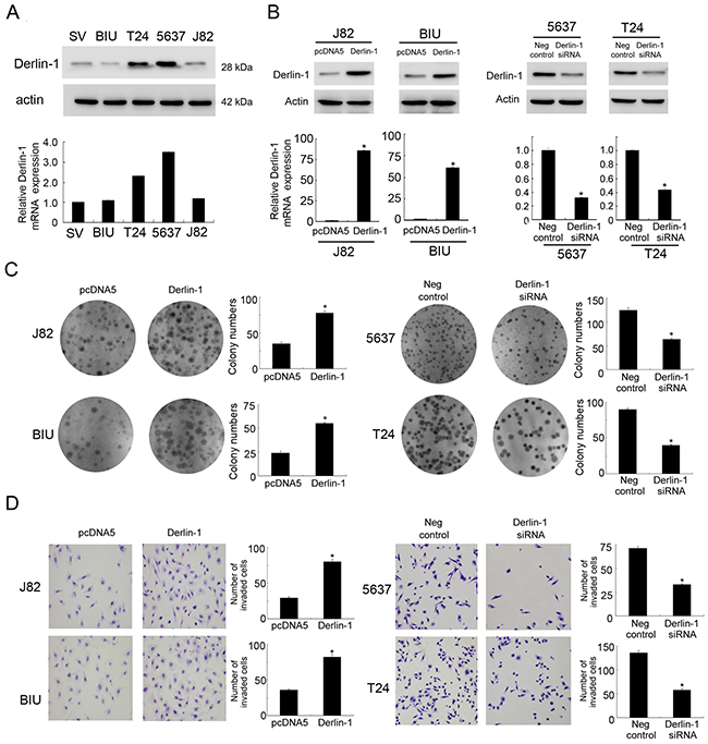 Figure 2: Derlin-1 overexpression in bladder cancer cell lines promotes proliferation and invasion. A. Western blot and RT-qPCR showed that Derlin-1 was high in 5637 and T24 cell lines while low in BIU-87, J82 cancer cell lines and normal SV-HUC-1 cell line. B. Western blot and RT-qPCR analysis showed that Derlin-1 transfection in BIU-87 and J82 cell lines increased its protein and mRNA expression. Derlin-1 siRNA treatment in 5637 and T24 cell lines decreased its protein and mRNA expression. C. Colony formation assay showed Derlin-1 overexpression facilitated cell proliferation in BIU-87 and J82 cell lines, while siRNA downregulated colony number in 5637 and T24 cell lines. D. Matrigel invasion assay showed Derlin-1 overexpression facilitated cell invasion in BIU-87 and J82 cell lines, while siRNA downregulated invading ability in 5637 and T24 cell lines.
