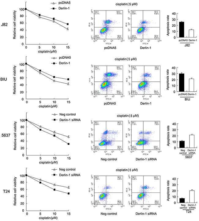 Figure 3: Derlin-1 confers cisplatin resistance in bladder cancer cells. MTT showed that Derlin-1 overexpression significantly upregulated cell viability in BIU-87 and J82 cells after 24 hours of cisplatin treatment (5, 10, 15μM). Derlin-1 depletion downregulated cisplatin resistance in 5637 and T24 cell lines. Annexin V/PI showed that Derlin-1 overexpression significantly downregulated cell apoptosis in BIU-87 and J82 cells after 24 hours of 5μM cisplatin treatment. Derlin-1 depletion in 5637 and T24 cell lines showed the opposite effects.