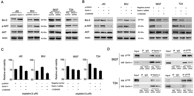 Figure 4: Derlin-1 interacts with p110α and regulates AKT/Bcl-2. A. Western blot showed thatDerlin-1 plasmid upregulated Bcl-2, p-AKT expression in BIU-87 and J82 cells. Derlin-1 siRNA downregulated Bcl-2, p-AKT expression in 5637 and T24 cell lines. B. Treatment of LY294005 blocked the upregulating effects of Derlin-1 on AKT phosphorylation and Bcl-2 in J82 and BIU-87 cells. LY294005 significantly downregulated p-AKT and Bcl-2 protein expression in T24 and 5637 cells. C. MTT results demonstrated that LY294005 reduced cell viability induced by Derlin-1 in J82 and BIU-87 cells treated with cisplatin. Similar to effects of Derlin-1 depletion, LY294005 significantly reduced cell viability in T24 and 5637 cells. D. Derlin-1 and PI3K p110α co-immunoprecipitated with each other in T24 and 5637 cells.
