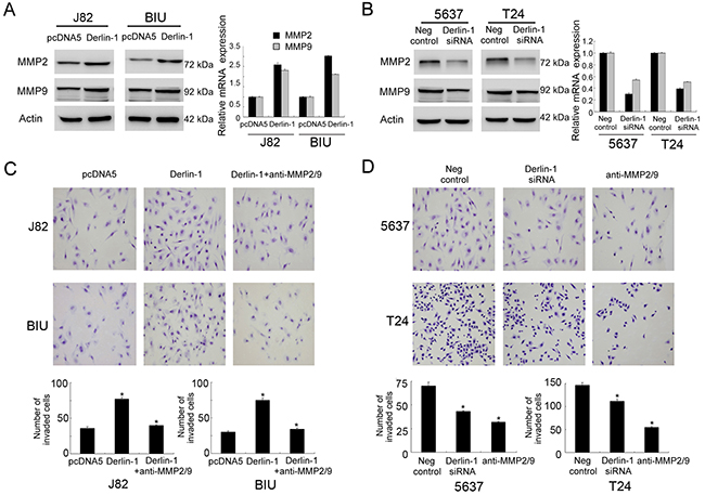 Figure 5: Derlin-1 regulates bladder invasion through MMP-2/9. A. Derlin-1 overexpression upregulated protein expression of MMP-2 and MMP-9. B. Derlin-1 siRNA decreased protein expression of MMP-2 and MMP-9. C. Matrigel invasion assay showed that treatment of MMP-2/9 antibodies blocked the invading effect of Derlin-1 in J82 and BIU-87 cell lines. D. Treatment of MMP-2/9 antibodies reduced invading ability of 5637 and T24 cells.