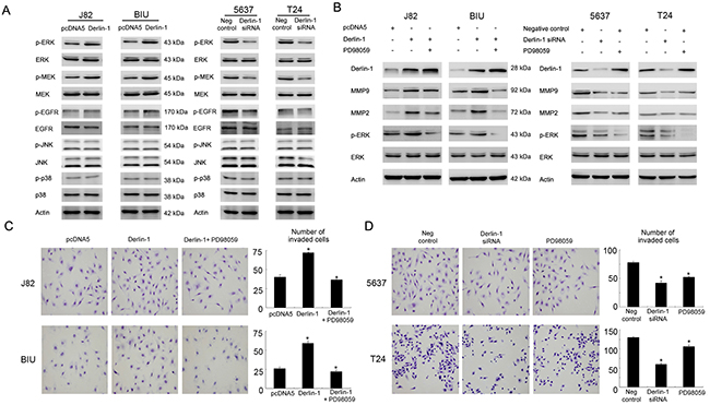 Figure 6: Derlin-1 regulates invasion through ERK signaling. A. Derlin-1 overexpression significantly upregulated ERK, MEK and EGFR phosphorylation in BIU-87 and J82 cell lines, without significant changes of JNK and p38 phosphorylation. Derlin-1 depletion downregulated ERK, MEK and EGFR phosphorylation. B. ERK inhibitor PD98059 treatment reduced MMP-2 and MMP-9 upregulation induced by Derlin-1 in BIU-87 and J82 cells. ERK inhibitor PD98059 reduced MMP-2/9 in 5637 and T24 cell lines. C. ERK inhibitor PD98059 treatment downregulated invading cell number in BIU-87 and J82 cells, which was upregulated by Derlin-1 plasmid. D. PD98059 treatment reduced invading cells in 5637 and T24 cell lines, which is similar to the effects of Derlin-1 siRNA.
