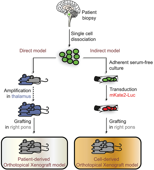Systematic stereotactic biopsies were re-introduced as a part of the histopathological and molecular diagnosis of DIPG [3]. We took advantage of this treatment-naïve biological material for pre-clinical model establishment representing the disease at the earliest stages possible. The aim of our study was to establish a variety of DIPG xenografts to cover the heterogeneity of DIPG encountered in patients. This is crucial to be able to understand the behavior of the different subtypes of DIPG and generalize the findings from new therapeutics testing. Two methods, direct or indirect xenografting, were tested. Biopsies were either directly xenografted in the thalamus or pons of nude mice, or in parallel cultured in vitro, labeled and subsequently injected in the pons of nude mice. These 2 types of pre-clinical models are valuable tools to assess new approaches in this incurable disease as they reflect the primary biopsy in terms of histologic features and expression of classical histopathology markers as well as they reflect the inter-biological differences between patients.