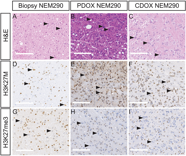 Figure 2: PDOX and CDOX NEM290 models display DIPG hallmarks. Representative results of Hematoxylin & Eosin colorations A-C. and IHC staining for H3-K27M D-F. or H3K27 trimethylation mark G-I. in the tumor biopsy NEM290 and the corresponding PDOX and CDOX. In all three cases, H&E and IHC allowed the detection of abnormally-shaped nuclei, tumor cells positive for the histone mutation K27M as well as cells losing the trimethylation marks at position 27 of histone H3, thus showing the conservation of the DIPG hallmarks in the PDOX and CDOX mouse models. Arrowheads in the different panels highlight example of characteristic tumor cells. (Scale bars: 125 µm).