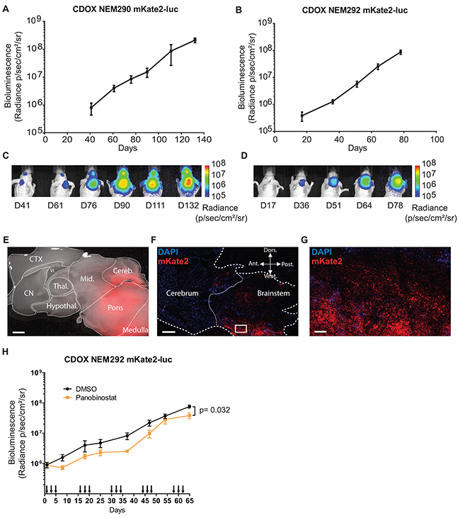 Figure 5: In vivo tumor growth can be monitored by bioluminescence and fluorescence. A-B. Longitudinal follow-up of tumor growth by quantification of the luciferase activity in the pontine region of CDOX NEM290 mKate2-luc and CDOX NEM292 mKate2-luc, respectively. Both models show a robust exponential growth of BLI. Results are represented as mean ±SEM (n=3 and n=5 replicate experiments). C-D. Corresponding representative images of bioluminescence in the aforementioned CDOX models. E. Overlay of bright-field and mKate2 fluorescence (red) microphotographs of a brain sagittal section of CDOX NEM292 at 5X magnification. Note the extensive infiltration and invasion towards the cerebellum and midbrain. (Scale bar: 1 mm). F. Confocal micrograph of a sagittal section of CDOX NEM292 with Hoechst (blue) and mKate2 (red) fluorescence at 10X magnification. (Scale bar: 1mm). G. 20X magnification of the square region highlighted in F, showing the infiltration of the parenchyma by tumor cells. (Scale bar: 100 µm). H. Preclinical evaluation of the activity of the panobinostat on DIPG tumor growth by longitudinal quantification of the luciferase activity in the pontine region of CDOX NEM292 mKate2-luc after panobinostat (n=7 mice) or DMSO (control vehicle, n=9 mice) injections. Panobinostat was administered I.P., three times a week at 10 mg/kg, every other week. Injections are indicated by arrows on the x-axis. Results are represented as mean ±SEM. *P < 0.05; Statistical permutation test (see methods). CTX: cortex; CN: cerebral nuclei; Thal.: thalamus; Hypothal.: hypothalamus; Mid.: midbrain; Cereb.: cerebellum; VL: lateral ventricle; Ant.: anterior; Vent.: ventral; Dors.: dorsal; Post.: posterior.