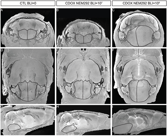 Figure 6: T2-sequence MRI modalities of DIPG are recapitulated in the brainstem of end-stage CDOX models. Anisotropic T2-sequence MR-Imaging at 11.2T of a non-grafted control mouse A, D, and G., CDOX NEM292 showing a 107 BLI level B, E, and H. and CDOX NEM292 showing a 108 BLI level C, F, and I. For visualization, images were focalized on the pons according to the coronal plane A, B, and C., the axial plane D, E, and F. and the sagittal plane G, H, and I. sections. Anatomical changes with a midline shift and pons hypertrophy were observed for the 108 BLI mouse only. A hyperintensity could also be observed in the pontine region (highlighted with dots in F). Brainstem and midline are depicted by dashed lines.