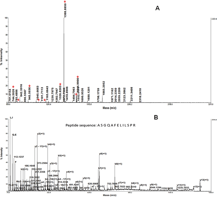 Figure 2: The result of the MALDI-TOF MS/MS analysis of the protein spot 1 MALDI-TOF-MS identified this protein as Stathmin/oncoprotein 18. The predicted molecular weight/pI value for Stathmin was 19 kDa/6.75. This is in concordance with the position of the spot on the 2-DE gel. MALDI-TOF-MS analysis confirmed that Stathmin exhibited a high protein score A. Peptide mass fingerprint of the tryptic digest of spot 1. Peptide signals identified were marked with asterisks. B. MS/MS profile of the peptide with a mass of 1388.8850 Da. y-ions resulting from fragmentation of the peptides and amino acids they represent are indicated.