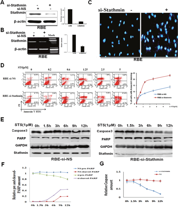 Figure 4: Stathmin decreased cholangiocarcinoma cell sensitivity to staurosporine. A. Stathmin-siRNA specifically decreased Stathmin protein levels. B. Stathmin-siRNA specifically decreased Stathmin mRNA levels by RT-PCR. C. After the cells were treated with 1μM STS for 4 hours, the nuclear condensation and fragmentation of the apoptotic cells was increased in the RBE-siStathmin cells. The result shown is from three independent experiments. D. Evaluation of apoptosis of the RBE-siNS and RBE-siStathmincells treated with different concentrations of STS using annexin V/PI staining. The cells were treated with various doses of STS for 4 hours, and were double stained with annexin-V-FITC and PI. Apoptosis was analyzed by flow cytometry. The right chart is the quantification of the data of Annecxin V analysis. E. The RBE-siNS and RBE-siStathmin cells were incubated with 1μM STS for different periods, and were then examined using anti-PARP and caspase-3 antibodies. GAPDH was used as the loading control. F. The chart shows the analysis of the quantitative ratios of pro-PARP and cleaved PARP, relative to the amount of GAPDH for the data mentioned. Each bar represents the mean ±SD of the three independent experiments. G. The chart shows the analysis of the quantitative ratios of caspase-3 relative to the amount of GAPDH for the data mentioned. Each bar represents the mean ± SD of three independent experiments.