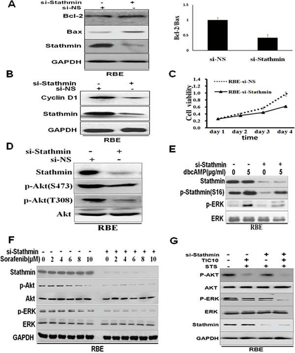 Figure 5: Knockdown of Stathmin in RBE attenuated the Akt and ERK phosphorylation levels. A. Western blot analysis of Bax and Bcl-2 expression in the RBE cells, transfected with 4μgStathmin-siRNA, or non-sense control, siRNA, as indicated. The right chart is the quantification of the Bax/Bcl-2 expression ratio by densitometric analysis. B. Expression of cell cycle regulatory protein, cyclinD1, after the RBE cell was transfected with Stathmin−siRNA, or non-sense control, siRNA, was detected by Western blotting. C. RBE cell viability was performed using the Cell Counting Kit-8® assay continuously for 4 days transfected with Stathmin−siRNA, or non-sense control, siRNA. D. The activity of Akt was inhibited in response to the RBE cells transfected with Stathmin-siRNA. E. dbcAMP was used to treat the RBE cells transfected with Stathmin-siRNA or non-sense control, siRNA. Western blot analysis was used to determine the expression of p-ERK, ERK and p-Stathmin (S16). F. Different concentrations of sorafenib-treated RBE cells were transfected with Stathmin-siRNA or non-sense control, siRNA. Western blot analysis was used to determine the expression of p-ERK and ERK, p-Akt and Akt. G. TIC10 was used in inhibition of Akt and ERK. 1μM STS was used for 4 hours after RBE-si NS and RBE-si Stathmin cells were treated with 2.5μM TIC10 for 36 h. Western blot was performed to check the efficiency of ERK and Akt activity in Stathmin-regulated apoptosis.